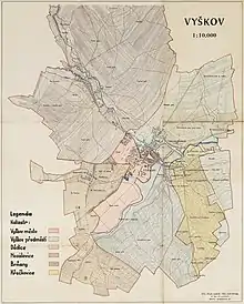 By its decree of 14 September 1949, the District Committee of Vyškov was finally able to state that "... the quoted decision of the former provincial committee in Brno on the merger of the municipalities of Vyškov, Dědice, Brňany, Křečkovice and Nosálovice came into force.".[38] Since 1950, Dědice has been part of Vyškov in the Vyškov district.[18][39]
