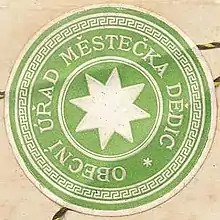 On the stamps of the municipal office of town Dědice from the second half of the 19th century and the first half of the 20th century, we meet a simple eight-pointed star. The typography, evidenced by a seal in the Joseph II's cadastre from 1787 with a shining eight-pointed star, was also used in important documents in the 19th century. The description of the paper seal from the beginning of the 20th century states: "Municipal office of the town of Dědice". The color of the paper seal used in the workbook mimics the color of the green wax used by medieval towns. The eight-pointed star is not made shining here. The star and the text of the description are white.