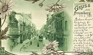 Długa street was laid out in the middle of the 14th century, at the time of the creation of the chartered city of Bydgoszcz. Until the beginning of the 19th century, it was the longest and the busiest street in the city, connecting two city gates : the Kujawska Gate to the east and the Poznan Gate to the west.[3] The street was flanked by two parallel running axis: Pod Blankami street on the south and Zaułek street on the north. Both streets were designed to carry supplies for horses in local stables.[4] The first residential buildings in Długa Street were made of wood, according to the wattle and daub technique. Brick houses appeared no earlier than 15th century.[4] The first written mention of Długa Street dates back to the middle of 16th: in the years 1559–1561, it was known as "Longa platea" or "Longa platea Civili" (Latin for "long civilian street"). In these sources, the numerous references are made to brick buildings, homes, dwellings, empty squares and breweries located in the street. Preserved entries from the 16th to the 17th century bear witness of a lively environment. Around 1619–1622, mention is made of 18 brick houses standing on the street. The owner of one of them was a city bailiff. Habitations along the street were housing many craftsmen, such as shoemakers, tailors, masons, locksmiths, as well as representatives of the nobility.