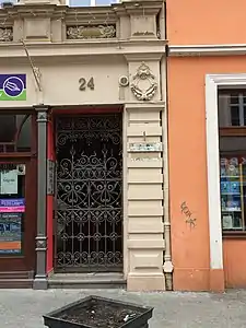 One can notice the pilasters as part of the avant-corps, as a reference to Roman architecture. The facade lower levels display Doric style, higher ones follow Corinthian style. Friezes delineate the facade, additionally decorated with floral motifs. The whole elevation is topped with a triangular Pediment with a tondo displaying a figure of a baby's head.[12]
