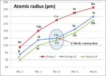 The d-block contraction (sometimes called scandide contraction[1]) is a term used in chemistry to describe the effect of having full d orbitals on the period 4 elements. The elements in question are gallium, germanium, arsenic, selenium, bromine, and krypton. Their electronic configurations include completely filled d orbitals (d10). The d-block contraction is best illustrated by comparing some properties of the group 13 elements to highlight the effect on gallium.
