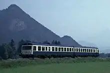 The three multiples of the transitional class, 628.1 (628 / 928 101, 102 and 103), were all stabled at Kempten im Allgäu from the outset. From here they were used until 8 December 2007 in regular services on the Ausserfernbahn and on the Illertalbahn. Until the timetable change in 2006 they also ran to other destinations in the Allgäu, e.g. on the line from Augsburg to Füssen. At their last general inspection in 2001/2002 the vehicles underwent a number of modifications in order to standardise them with the sub-class 628.2. In early 2008 all 628.1s were withdrawn and, in that year, they were transferred to Hamm. In 2012 two units - 628 102 and 103 - were sold to the Sodema Inc. Société de gestion des équipements publics de Charlevoix[3] in Canada where they operate in the Charlevoix region as the Charlevoix tourist train.[2][4][5][6]