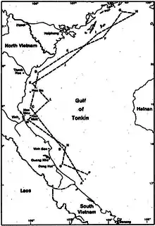 SIGAD USN-467N specifically designates the DSU aboard USS Maddox during the patrol involved with the Gulf of Tonkin incident.[5][8] This patrol was 18th DESOTO type patrol (each with a Naval Security Group detachment embarked) conducted since 1962.[9] On August 2, 1964, the destroyer Maddox, engaged three North Vietnamese Navy torpedo boats of the 135th Torpedo Squadron.[10] A sea battle resulted, in which Maddox expended over two hundred and eighty 3-inch (76 mm) and 5-inch (127 mm) shells, and in which four USN F-8 Crusader jet fighter bombers strafed the torpedo boats. One US aircraft was damaged, one 14.5-millimeter (0.57 in) round hit the destroyer, three North Vietnamese torpedo boats were damaged, and four North Vietnamese sailors were killed and six were wounded; there were no U.S. casualties.[11]