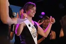 ![]() Finnish drag queen Miss B on stage at DTM's Mannerheimintie location in 2019 | |