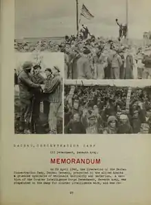 The 649th Engineer Topographic Battalion of the U.S. Army took over the printing and duplication of the report, which was published in typewritten form.[13] By May 1945, 10,000 copies had aready been circulated.[5] The Dachau Report was, according to the memoirs of William W. Quinn initially intended only as an internal report for use in the US Army, but then got to journalists unplanned through display in a press room, making it known to the public.[14] It soon circulated among US soldiers and members of the press.[6][15]