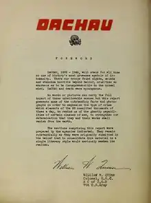 The report was completed rather quickly, within the span of one to two weeks.[8][9] The report is divided into four parts, listed in a table of contents on the third page of the document. Part I features the foreword by William Wilson Quinn while Part II was prepared by the Office of Strategic Services. Part III was prepared by the Psychological Warfare Branch and Part IV prepared by the Counter Intelligence Corps. Parts II to IV partly overlap thematically, since they were prepared as individual reports that were largely independent of each other. According to the preface, the reports were deliberately not combined into a common document with a uniform style, as doing so would have "seriously weaken[ed] [their] realism".[10] In the summary preceding the second part of the report, it noted that the report does not intend to be a comprehensive or exhaustive account of Dachau Concentration Camp, and that work was already being done on further, more comprehensive reports.[11] Thus, in preparation for the War Crimes Trial Program, American investigators conducted investigations from April 30, 1945 to August 7, 1945 to determine who was responsible for the crimes associated with the Dachau complex. This investigation report, completed on 31 August 1945, was the basis for the Dachau Camp Trial.[12]
