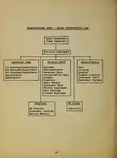 The sociology and social psychology of the system of prisoners and prisoner groups, their interactions with each other[20] the commanding SS, and the so-called prisoner administration or labour administration[21] are detailed through an organizational chart.[22] The report also contains statistical listings of prisoner numbers and the proportion of different nationalities[23] and the crimes charged, as well as figures on deaths in the camp, which rose sharply from autumn 1944 onwards.[24] Accounts of the social dynamics among the prisoners[20] also make up a large part of the report, such as the interaction between prisoner groups of different nationalities, and how these differences were deliberately instrumentalised by the SS for purposes of control and oppression; for example, German inmates were placed in administrative positions in order to stir anti-German sentiment among non-German inmates.[25]