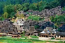 Most Dai live in the Pingba region. Abundant rainfall with an annual average temperature of 21 ℃ makes a very suitable environment for building bamboo structures. Bamboo buildings are easy to set up, and are breathable and cool to avoid miasma, dampness and flooding, while resisting earthquakes and preventing insects and snakes from entering.[1]
