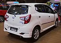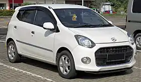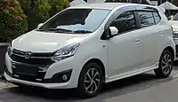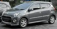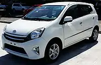 The Daihatsu Ayla is a city car designed by Daihatsu and manufactured by Astra Daihatsu Motor in Indonesia, primarily developed for emerging markets. The Ayla is sold by Toyota as the Toyota Agya in Indonesia, South Africa,[12] Tunisia,[13] Americas (except Canada, Mexico and the United States), and Toyota Wigo in the Philippines, Sri Lanka, Brunei and Vietnam through an OEM agreement.[1][14][15] The car is also redesigned and manufactured in Malaysia by Perodua as the Perodua Axia.[16]