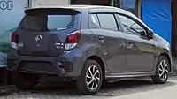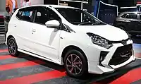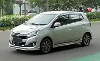 The Ayla (1.2-litre variants) and the Indonesian-market Agya received their second facelift on 19 March 2020.[29][30][31][32] This facelift includes an updated front bumper design,[33] updated tail light cluster, redesigned side mirrors (with auto retractable function for Ayla 1.2 R, Agya 1.2 G and 1.2 TRD S trims), updated 14-inch alloy wheel design, black-coloured rear spoiler (for Agya 1.2 TRD S trim), digital air conditioner controls, touchscreen entertainment system with DVD player (for Ayla 1.2 R and Agya 1.2 TRD S trims), keyless entry system with engine start/stop button (for Agya 1.2 TRD S trim) and an updated seat cover and door trim pattern on some trim levels. The 1.0-litre Ayla variants retained the same design from the previous version.[34][35] On 9 August 2021, the TRD S trim of the Indonesian-market Agya was renamed to GR Sport,[36] and the TRD logo on the rear spoiler was removed. The 1.0-litre Agya variants was also removed as well in November 2021.