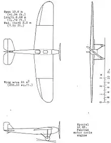 - Powerplant: 1 × Harley-Davidson two cylinder, geared down 3:1, 9.3 kW (12.5 hp) . Removable for use as glider