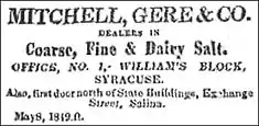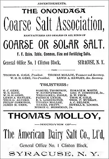 In the 1890s, many brands of dairy salt were available.[4] In England during this time, the Ashton and Higgins Eureka Salt brands were available (among others), and were used in the United States.[4] U.S. brands of dairy salt in the 1890s included Diamond Crystal Salt and Genesee Salt, among others.[4] Almost all of these brands were very pure, being 98–99% sodium chloride.[4]