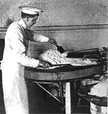 In 1914, it was written that American and Danish authorities were in agreement that large-sized, flat flake salt is the best type of dairy salt for use in butter products.[7] During this time, almost all dairy salt was prepared using the process of evaporation. Some techniques included leaving brine in the sun to evaporate, or heating it with fire underneath iron pans, with the salt crystals remaining after the liquid evaporated.[7] Additional methods included the Michigan grainer process and the vacuum pan process.[7]