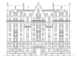 The Dakota is a square building built around a central courtyard. The arched main entrance is a porte-cochère large enough for the horse-drawn carriages that once entered and allowed passengers to disembark sheltered from the weather. Many of these carriages were housed in a multi-story stable building built in two sections between 1891 and 1894, at the southwest corner of 77th Street and Amsterdam Avenue, where elevators lifted them to the upper floors. The "Dakota Stables" building was in operation as a garage until February 2007, when it was slated to be transformed by the Related Companies into a condominium residence.[11] Since then, the large condominium building The Harrison occupies its spot.[9][10]