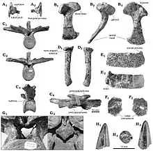 Dakotasuchus (meaning "Dakota [Sandstone] crocodile") is a genus of goniopholidid mesoeucrocodylian. Its fossils have been recovered from the Cenomanian-age Upper Cretaceous Dakota Sandstone of Kansas.[1] The type specimen was found in an iron-cemented sandstone concretion near Salina. This concretion was broken into two large pieces; more of the specimen was probably present originally, but by the time it was found only the torso and short portions of the neck and tail remained. Twenty pairs of bony scutes ran down the midline of the back.[2][3] The vertebrae lacked the procoelous articulation (concave anterior and convex posterior faces) of more derived crocodyliforms. Dakotasuchus had short broad shoulder blades, suggesting it had stout powerful forelimbs and perhaps terrestrial habits. M. G. Mehl, who described the genus, estimated the length of the type individual when complete to have been 3–4 metres (9.8–13.1 ft). The type species is D. kingi, named for Professor King, a former dean of Kansas Wesleyan University.[4] Mehl did not classify his new genus to a more inclusive group than Mesosuchia (a paraphyletic group replaced by Mesoeucrocodylia). Robert Carroll assigned Dakotasuchus to Goniopholididae in 1988.[5] In 2017, fossils of Dakotasuchus kingi which consisted of a coracoid, scutes, a dorsal vertebrate and postcranial bones were found in Utah, specifically in the Cedar Mountain Formation's Mussentuchit Member.[6]
