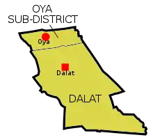 The Dalat District is located in Mukah Division, Sarawak, Malaysia. It is situated by the Oya river. The district covers areas from Kg. Penat to Oya, and from Muara Sg. Kut to Ulu Baoh.[2] The district has an area of 905.29 km2, while the Oya sub-district has an area of 147.47 km2.
