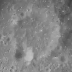 It is a relatively shallow and insignificant crater formation with a somewhat eroded outer rim. A smaller crater lies across the south-southwestern rim, creating a break into the interior. The rim is somewhat lower along the north edge than elsewhere, and the feature is marked only by a few tiny craterlets.