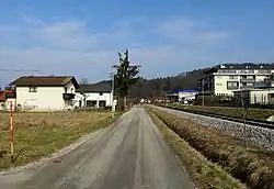 Daljna Vas was an elongated settlement below Orle along the southwest base of Fat Hill (Slovene: Debeli hrib, elevation: 395 meters or 1,296 feet) and continuing southeast along the road and rail line to Škofljica.[1] The Ljubljana Marsh lies to the southwest.