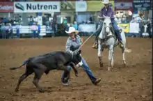 The event begins when the steer breaks the barrier.[3] The roper must rope the steer. Any type of catch is legal. The roper must then "dally" which is to make several loops around the saddle horn with the rope. The runner must then grab the ribbon off the calf's tail. The runner then races back to the box, and the time is stopped once the runner crosses the barrier.[4] Many organizations, like the National Little Britches Rodeo Association allow coed teams.[5]