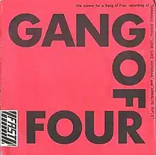 "Damaged Goods" is a song by English post-punk band Gang of Four. Acting as their debut single, it was released on 13 October 1978 through independent record label Fast Product.[1] Produced by Fast Product owner Bob Last under the alias "Fast Product", the single received critical acclaim, prompting the band to sign to major label EMI. The title track and "Love Like Anthrax" were re-recorded for Gang of Four's debut album Entertainment! in 1979 and the whole EP was included in the Fast Product compilation Mutant Pop in 1980.[2][3]