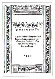 In 1548, Góis was named Guarda-Mor (High Guardian) of the Torre do Tombo (Royal Archives) and ten years later was entrusted by the same Cardinal Henry to write the chronicle of Manuel I’s reign. The task has been previously confided to de Barros, but relinquished by him.[2] The work was completed in some seven years and became his major achievement; nonetheless it was widely attacked and parts of it were significantly censored.[2] He also published a description of the city of Lisbon – Urbis Olisiponis Descriptio (1554).