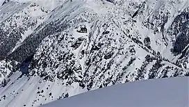 Damnation Peak is a 5,635-foot-elevation (1,718 meter) mountain summit located in the North Cascades of Washington state. It is situated within North Cascades National Park, Stephen Mather Wilderness, and Whatcom County. Like many North Cascades peaks, Damnation Peak is more notable for its large, steep rise above local terrain than for its absolute elevation. Topographic relief is significant as the south aspect rises 2,800 feet (853 meters) above Damnation Creek in approximately 1.5 mile, and the north aspect rises 3,000 feet (914 meters) above Triumph Creek in one mile. Precipitation runoff from the mountain drains into these tributaries of the Skagit River. Neighbors include Mount Triumph, 2.8 miles (4.5 km) to the north-northeast, and Trappers Peak is 2.8 miles (4.5 km) to the east-northeast.[2] The town of Newhalem is six miles to the east. In 1938, Lloyd Anderson climbed a nearby summit which is known today as Thornton Peak and called it "Damnation."[1]