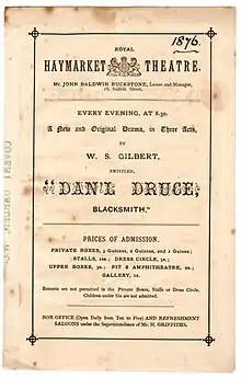 Dan'l Druce, Blacksmith is a play by W. S. Gilbert, styled "A Three-Act Drama of Puritan times". It opened at the Haymarket Theatre in London on 11 September 1876, starring Hermann Vezin, Johnston Forbes-Robertson and Marion Terry. The play was a success, running for about 100 performances and enjoying tours and several revivals. It was popular enough to be burlesqued in a contemporary work, Dan'l Tra-Duced, Tinker, at the Strand Theatre.[1] In an 1894 revival, Nancy McIntosh played Dorothy.