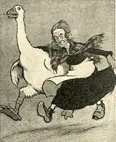 Leno considered the dame roles in two of his last pantomimes, Bluebeard (1901) and Mother Goose (1902), written by J. Hickory Wood, to be his favourites. He was paid £200 (£22,198 in 2022 adjusted for inflation)[26] for each of the pantomime seasons.[58][59] Leno appeared at Drury Lane as Sister Anne in Bluebeard, a character described by Wood as "a sprightly, somewhat below middle aged person who was of a coming on disposition and who had not yet abandoned hope"[60] The Times drama critic noted: "It is a quite peculiar and original Sister Anne, who dances breakdowns and sings strange ballads to a still stranger harp and plays ping-pong with a frying-pan and potatoes and burlesques Sherlock Holmes and wears the oddest of garments and dresses her hair like Miss Morleena Kenwigs, and speaks in a piping voice – in short it is none other than Dan Leno whom we all know".[61] Mother Goose provided Leno with one of the most challenging roles of his career, in which he was required to portray the same woman in several different guises. Wood's idea, that neither fortune nor beauty would bring happiness, was illustrated by a series of magical character transformations.[62] The poor, unkempt and generally ugly Mother Goose eventually became a rich and beautiful but tasteless parvenu, searching for a suitor. The production was one of Drury Lane's most successful pantomimes, running until 28 March 1903.[62]