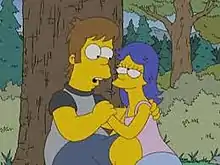 Back in 1976, Ned comforts Homer, who is despondent at Marge's absence the previous night, and encourages him to consider marrying Marge in the future. Taking a walk through the woods with Marge, Homer carves the message "Marge + Homer 4ever" into a tree. In the present, Homer sees this message, and tries to cut it out of the tree to show to Marge as a symbol of their everlasting love. Marge arrives to reassure him but accidentally knocks the tree over a ravine. Homer clings onto the bark and falls down the ravine toward the river below with Marge falling after. They are saved by Bart and Lisa in their pedal car, which Bart had accidentally driven into the river.