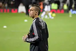 Outside of football, Agger is a qualified tattoo artist.[59] He has numerous tattoos including a Viking on his upper right arm, a large drawing of Vikings and a graveyard that spans his whole back,[60] which includes his birth date and the Latin motto "Mors certa, hora incerta" ("death is certain, its hour is uncertain"),[61][62] forming a memento mori. He also features an intricate band around his left elbow which includes the phrase "Succes er at leve som man selv vil" ("Success is to live as you wish" in Danish). In August 2012, during a period of intense speculation regarding his future at the club, Agger had the letters "YNWA" tattooed on the fingers of his right hand, referencing the anthem of Liverpool F.C., "You'll Never Walk Alone".[63]