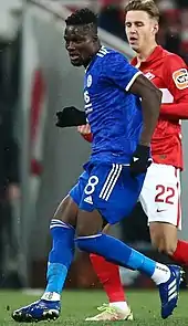 In the 2016–17 season, Amartey became a first team regular following the departure of N'Golo Kanté.[18] partnering teammate Danny Drinkwater in the central midfield role.[19] While his workrate roughly equalled Kanté's, he has been unable to match his tackles and interceptions.[20] On 14 September 2016, Amartey started in his Champions League debut for Leicester in a 3–0 away win over Club Brugge in the group stage.[21] Amartey scored his first goal for Leicester in an 88th-minute equaliser away at Stoke City on 17 December 2016, salvaging a 2–2 draw.[22] On 8 February 2017, just over 12 hours after returning to Leicester from international duty, Amartey played 120 minutes (including AET) in a 3–1 FA Cup fourth-round replay win over Derby County.[23]