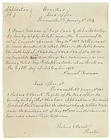Daniel Freeman (April 26, 1826 – December 30, 1908) was an American homesteader and Civil War veteran. He was recognized as the first person to file a claim under the Homestead Act of 1862.[1]