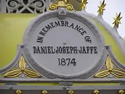 Daniel Joseph Jaffe (August 19, 1809 - January 21, 1874) was a German merchant who came to Belfast in 1850 to establish a linen export business.[1] He was the father of Otto Jaffe, who was twice Lord Mayor of Belfast and its first and only Jewish Lord Mayor. He is regarded as the founder of Belfast's Jewish community and built the city's first synagogue in 1871.[2][3] Prior to coming to Belfast, Jaffe owned a considerable mercantile business in Hamburg. His business was also active in Dundee, Leipzig, and Paris.[4] He was born in Schwerin, Mecklenburg-Vorpommern in 1809 and died in Nice, France in 1874 aged 64 and is interred in the Jewish section of Belfast City Cemetery.[4] In 1874, the same year of his death, a drinking fountain was erected to his memory at Victoria Square in Belfast. In 2007, the monument was taken to Shropshire, England to be repaired due to its poor condition and was returned to its original location in February 2008.[4]