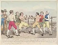 Believing the porter was cheating his frail employer, Mendoza accepted the challenge on his behalf. Richard Humphries acted as Mendoza's second. Humphries would later act as a manager for Mendoza, arranging training facilities and securing payment for fights.[15] The duel with the porter took place in the street outside the tea dealership in a hastily constructed ring. The fight lasted for forty-five minutes, ending when the porter declared he was unable to continue. This victory brought a small measure of fame to Mendoza, as stories of the fight spread through the surrounding neighborhoods and portrayed Mendoza as the talented whippersnapper who had not just beaten, but thrashed his larger opponent.[16][3][14]