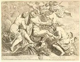 His graphic work is mainly distinguished by its cursive and quick character, which predates developments in the 17th century. This is quite evident in his Deification of Aeneas by nymphs and cupids, which likely dates from his Mantuan period. This work shows the classicist influences of Giulio Romano as well as the Flemish Baroque with its muscular and bearded hero Aeneas who is being submitted by the robust nymphs to a grooming before his elevation to godly status. His print of a Bacchanal on the other hand shows the possible influence of Giovanni Benedetto Castiglione who was also active in Mantua.[5] A preliminary study for this print is kept at the British Museum. The heavy use of the brush and the painterly quality of the landscape in the drawing also show a closeness to Castiglione.[3]