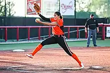 O'Toole was named Mountain West Conference Freshman of The Year and First-Team All-Conference.[2] She debuted on February 8 losing to the Stephen F. Austin Lumberjacks and throwing four innings with six strikeouts.[3] On March 14, O'Toole set a career best for strikeouts in a regulation game with 9 whiffs against the Bryant Bulldogs in a victory.[4] She also began a career best shutout streak in that game that went on for 22 innings, during which the Aztec struck out 18, allowed 21 hits and two walks for a 1.04 WHIP.[5] For her sophomore year, O'Toole earned MWC Pitcher of The Year, her second all conference honors and set a career best in victories (then school record) and innings pitched.[6] O'Toole currently ranks top-10 for San Diego in wins, strikeouts and shutouts, while holding the winning percentage record for a career.[7]