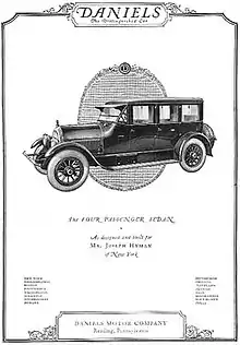 Daniels Motor Company was a pioneer brass era American automobile company, founded in 1915 by George E. Daniels (formerly of GM AND Buick) with Neff E. Parish.[1] George Daniels was a known lawyer, engineer, and mechanic. He was considered the best motorcar designer in the United States.[2] Neff Parish had his own automobile parts and framing manufacturing company. Neff was the creator of the time's highest-grade heat-treated alloy steel frames, respected in the steel industry.[3] Daniels Motor Company produced 1,500 high quality automobiles between 1916-1924, branding themselves as “the distinguished car with just a little more power than you will ever need”, and “The aristocrat of American cars”.[4]