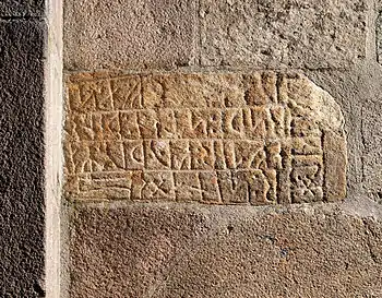 The inscription on DR 48 consists of four lines of horizontal and one line of vertical runic text on a 1.1 m × 0.5 m (3 ft 7 in × 1 ft 8 in) granite block. The stone dates from the 12th century and was reused after being shaped in the construction of the south chancel wall of a church in Hanning.[1] Before the historic nature of runestones was understood, they were often re-used as material for the construction of roads, bridges, and buildings. Although clearly visible in the wall for several centuries, the existence of the runestone was first reported in 1843.[2] Because the stone was shaped for use in the wall, a portion of the text has been lost. The inscription also depicts a hammer within the runic text after the Old Norse word sina, which has been interpreted as being Thor's hammer Mjöllnir. Thor's hammer was used on several memorial runestones in Sweden and Denmark, perhaps as a parallel to or a pagan reaction to the use of the cross by Christians.[3] Other surviving runestones or inscriptions depicting Thor's hammer include runestones U 1161 in Altuna, Sö 86 in Åby, Sö 111 in Stenkvista, Vg 113 in Bjärby, Öl 1 in Karlevi, DR 26 in Laeborg, DR 120 in Spentrup, and DR 331 in Gårdstånga.[4][5] Because of the dating of the inscription to the 12th century based upon linguistic analysis,[6] which is some 200 years after the Christianization of Denmark, some have questioned whether the hammer is actually a statement of heathenism. It has been suggested that the hammer is not a depiction of Mjöllnir but is instead a symbol identifying a blacksmith or other occupation.[5] However, there are no parallels of such symbolic depictions on other medieval runestones, and the hammer is very similar to that on DR 26 in Laeborg, which is considered to be a depiction of Mjöllnir.[5]