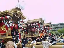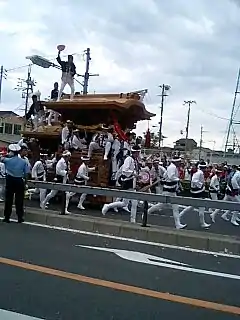 Danjiri are large wooden carts (danjiri guruma) in the shape of a shrine or temple. The carts, often being crafted out of wood, are very ornate, with elaborate carvings. Towns with danjiri festivals in them have different neighborhoods, each with their own guild responsible for maintaining their own danjiri cart. The cart is kept in storage for most of the year. As the festival approaches, the danjiri cart is prepared with elaborate flower arrangements, prayer cards, ornaments, and religious consecrations. They also make a special song every year. It is believed that spirits or gods reside in the danjiri. The person on the roof of the Danjiri cart controls the direction of movement and performs a traditional fan dance.[3]