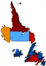 After the vote count, the Progressive Conservatives emerged with nine more seats than they held at the dissolution of the previous legislature. The party had won 69.5 percent of the popular vote, the highest popular vote share ever attained by the PC party in the province. Three Liberal incumbents, as well as NDP leader Lorraine Michael, successfully held their seats.[37] Notably, however, Liberal leader Gerry Reid was not reelected in his own district.[38] The next month Williams' Progressive Conservatives increased their seat count to 44 out of 48, after winning a deferred election in Grand Falls-Windsor-Buchans following the death of Liberal candidate Gerry Tobin on October 1.[39][40]