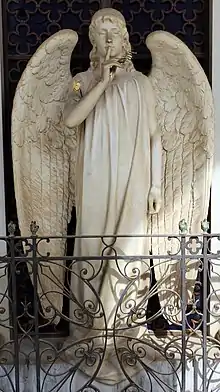 He completed six bronze statuettes for an altar in Pomarance, and marble bust of Beatrice, donated to the City Hall of Florence, and placed at the Casa di Dante. Among the funereal monuments are a funereal monument for the ValIeri at Cemetery of Antella, a medallion of cavaliere Tartini Selvatici. Or the monument for the Bianchini family at the Cemetery of Rimini, and a bust in marble of the professor Pacini, for the Hall of Anatomy at the Ospedale of Florence, and of other famous Florentines for display in the Cloister of Santa Croce. He completed a funereal monument for the Giudice of the City of Montevideo, Uruguay. In white marble, a widow kneels before a plaque below the bust of the departed. He became a professor of sculpture at the Academy of Fine Arts of Florence.[2]