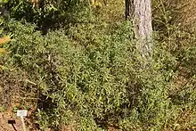 The shrub grows with an erect habit, to a height of 0.4 m to 0.8 m. It flowers from May to June, and bears fruit from July to September.[2]