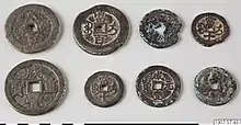 Other proposals sought to introduce gold and even jade to the Chinese monetary system and wanted to ban all non-religious usage of precious metals like gold and silver.[3] The most influential proposals turned out to be the ones advocating for both the debasement of the copper coinage and the introduction of high denomination copper-alloy cash coins.[3] Furthermore, some proposals recognised the difficulty of establishing multiple exchange rates between all the new monies and the high transaction costs that would burden low-value currencies such as the copper-alloy cash coins, these proposers advocated for the re-introduction of paper money, either convertible or inconvertible into metallic currencies.[3]