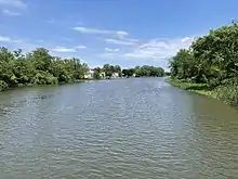 The creek turns south and enters the John Heinz National Wildlife Refuge 4.5 miles upstream from its mouth. At this point it passes through the largest freshwater marsh in Pennsylvania before becoming entirely tidal. It turns west-southwest for a few miles, passing by Philadelphia, Folcroft, Norwood, Prospect Park, Tinicum Township, and Ridley Township and receives the tributary Muckinipattis Creek from the right. Darby Creek winds through a large lagoon 30 ft deep in places that was dredged in the 1960s.[3] The creek then receives Stony Creek, its last named tributary, from the right and turns south for a few tenths of a mile before reaching its confluence with the Delaware River.[2]