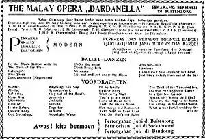 Their plays were presented in Malay and often adapted works by other writers.[3] Some works, such as those by Victor Ido, were translated from the original when adapted for stage.[3] Dardanella and its contemporary rival Miss Riboet's Orion – established a year before – were some of the first travelling troupes in the Indies to use original works; earlier bangsawan and stambul troupes had used broad outlines of foreign works.[15][10] The two were the most popular troupes from the Indies of their time.[10]