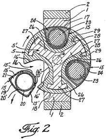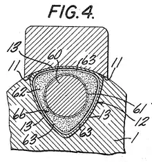 Dardick's patent 2,865,126, issued in late 1958, is for a new and improved cartridge for the open-chamber gun. Unlike the previous open-chamber cartridge, this version shows the symmetrical tround shape, which would facilitate feeding from a magazine, since the trounds can enter the split in any orientation and end up seating correctly. This reduced the complexity and cost of the open-chamber firearm design, making it feasible for commercial production. The trounds were constructed of either high-strength plastic or aluminum to provide strength.[2] While trounds were only commercially available as cartridges suitable for handguns, prototype military trounds were made in larger calibers.