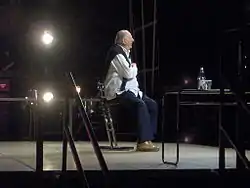 In 2005, Fo revealed plans to run for Mayor of Milan, the most economically important city in Italy, the following year. He said it was part of his ongoing fight to rid Milan of Berlusconi's political colleague Gabriele Albertini, the incumbent mayor.[108] Ostracised by Italian television (both state—RAI having shunted his latest show off to a graveyard slot—and commercial—three quarters owned by Fo's long-time adversary Berlusconi), Fo instead elected to campaign on stage.[109] Under the slogan "I am not a moderate", he opposed the centre-right administration's plans to demolish parts of the city centre and vowed to chase out those "money-grabbing bastards who have run this city for decades."[110][111] Securing 23.4% of the vote in the primary election of centre-left The Union in January 2006, he was ultimately unsuccessful, finishing second to Milan's former police chief Bruno Ferrante.[112]