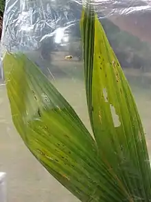 When larvae are ready to pupate, they migrate to protected areas of the host and pupate in clusters. The pupal stage lasts for 17–21 days.