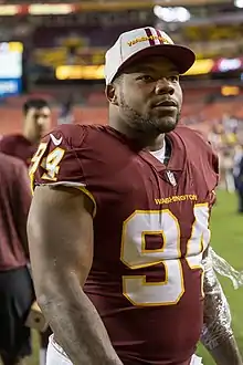 Payne was drafted by the Washington Redskins in the first round (13th overall) of the 2018 NFL Draft.[14][15] On May 10, 2018, Payne signed a four-year contract worth US$14.4 million featuring a $8.56 million signing bonus.[16] He recorded his first career sack in Week 3 against the Green Bay Packers.[17] He finished his rookie season with 56 tackles, five sacks, a forced fumble and fumble recovery, and was named to the 2018 PFWA All-Rookie Team as a result.[18]