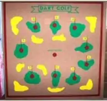 Dart golf games are games in which darts are thrown at traditional dart boards or dart boards that resemble golf courses with colored areas that represent a golf course. Dart golf games use golf-like rules and scoring. Rules and board configurations of the game vary from league to league, but are generally played single, head-to-head or with teams.